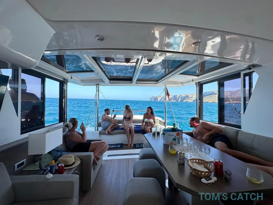 Katamaran mit einem großzügigen Heckspiegel (7 Meter), der das gleichzeitige Angeln mit mehreren Ruten problemlos ermöglicht. Der niedrige Freibord am Heck erleichtert das Anbordholen der Fänge.