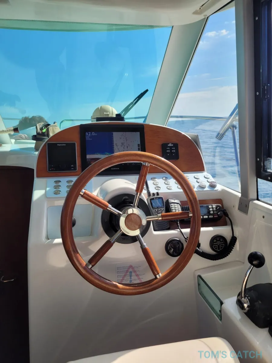 Voll ausgestattetes Angelboot, ideal zum Schlepp- und Grundangeln. Ausgestattet mit besonders robusten Rutenhaltern, großen Lebendfischbehältern, elektrischem Kühlschrank, elektrischem WC und vielen weiteren Details, die ein komfortables und sicheres Angelerlebnis auf hohem Niveau garantieren. Perfekt für Angelfans, die Wert auf Qualität und Funktionalität legen.