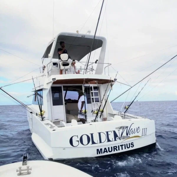 Kommen Sie an Bord der Golden Wave III, einem 42-Fuß-Sportfischerboot in der unberührten Black River-Region von Mauritius, mitten im Herzen des Indischen Ozeans. Angetrieben von zwei Caterpillar 3208 Diesel-Innenbordmotoren, ist dieses Schiff gut ausgestattet, um ein spannendes, stabiles und komfortables Erlebnis für bis zu sechs Gäste plus Crew zu bieten.