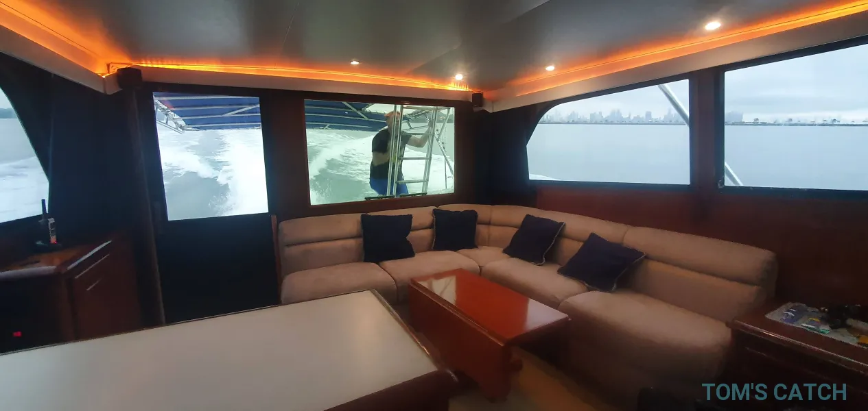 Auf der komfortablen Flybridge haben Sie einen ausgezeichneten Platz, um Köderbälle und allgemeine Angelindikatoren auszumachen, mit Sitzgelegenheiten für eine große Familie.