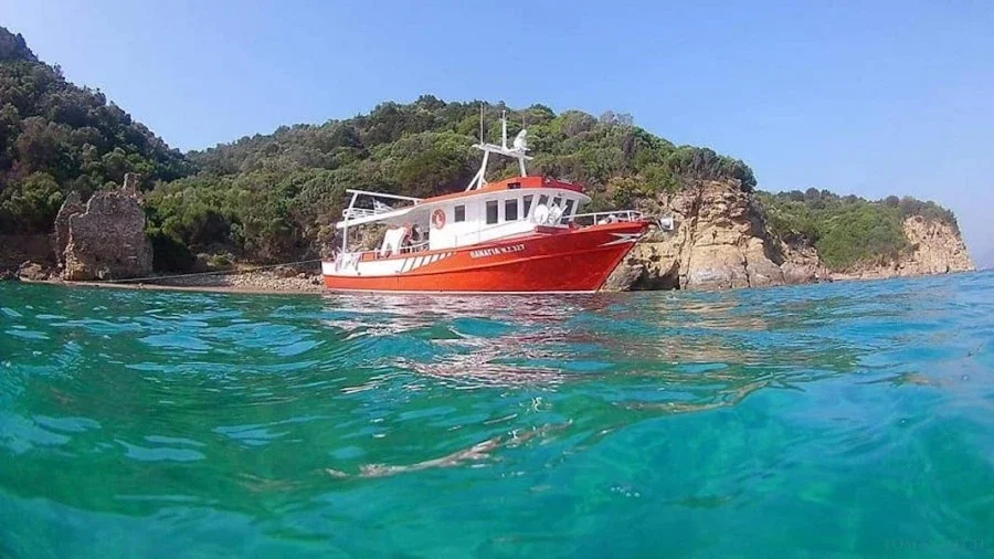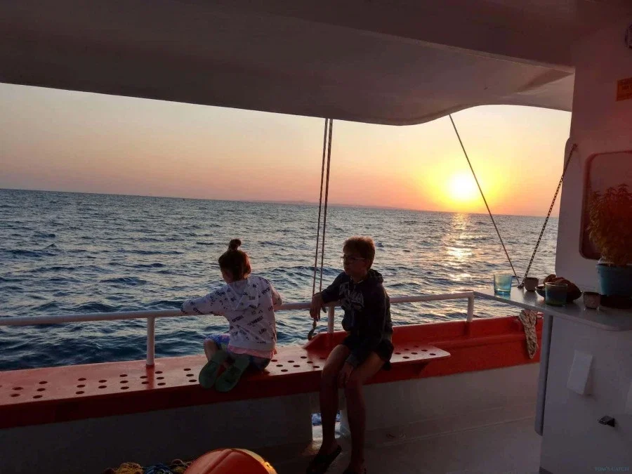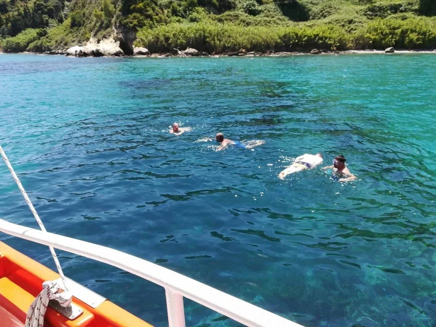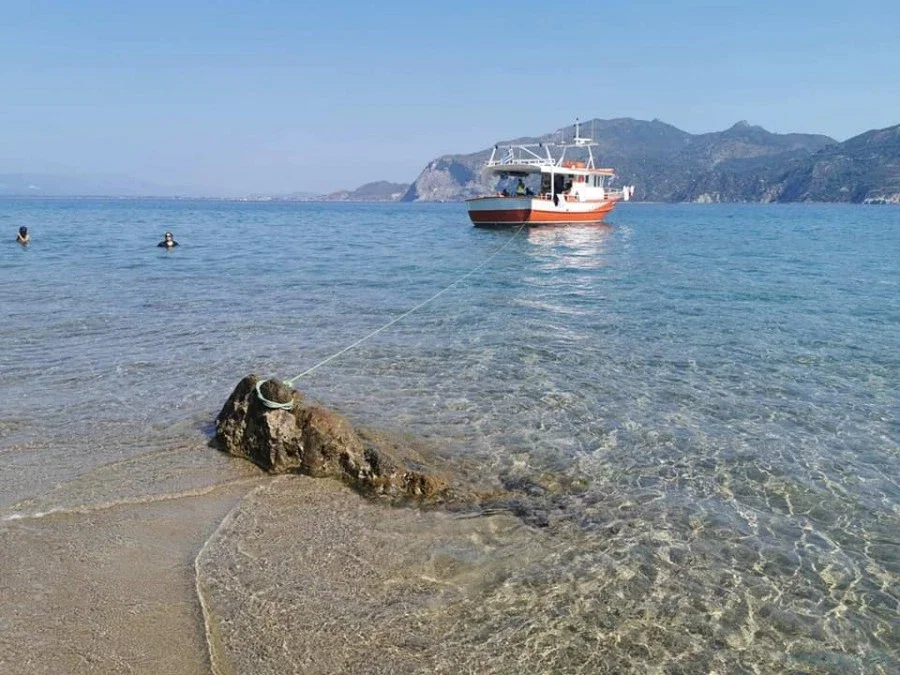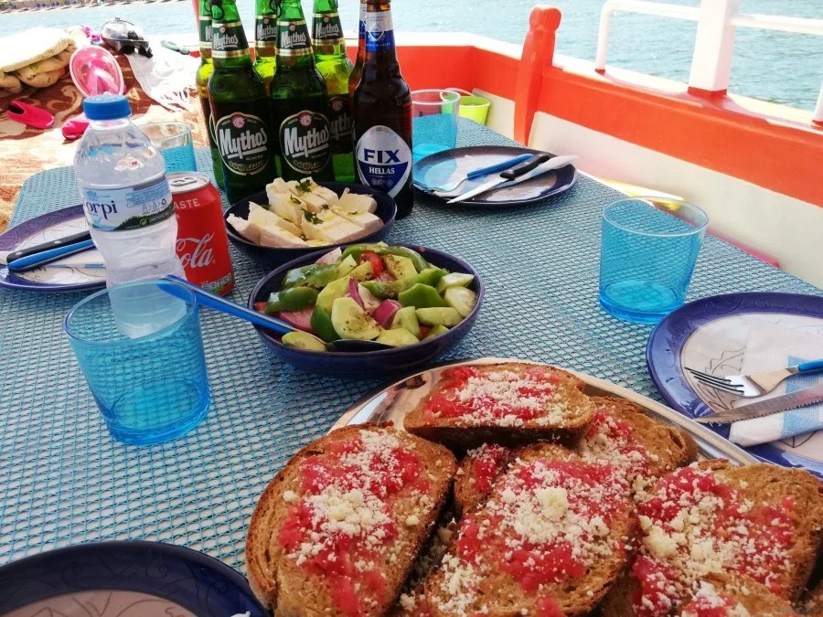 El Capitán Giorgos captura los peces con redes. Puedes ayudarlo o mirarlo. Una vez que los peces estén a bordo, te dirigirás a una bahía para nadar y Giorgos comenzará a cocinar para ti.