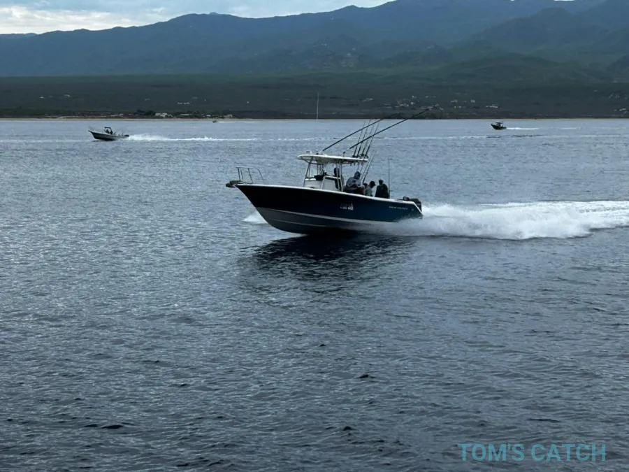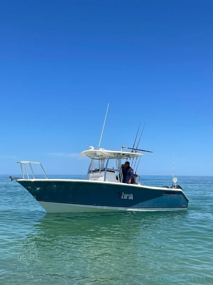 Powered by two Yamaha 150 engines, Zorah can reach 32 mph, quickly getting you to the best fishing spots. The boat includes a spacious console bathroom, bow shade to escape the sun, and Seadek flooring for comfort. The bow platform is perfect for casting and baiting, ensuring an exceptional sportfishing experience.