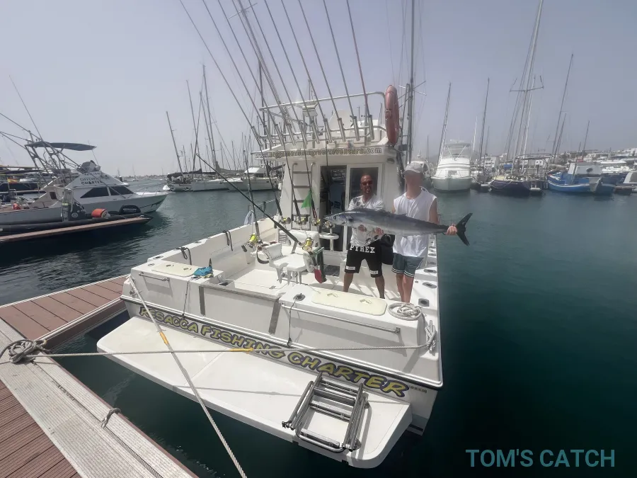Our boat is a motor catamaran equipped with everything you need for deep sea fishing, pompanette 130 lbs fighting chair, double spreader outriggers, cockpit and fly cameras.