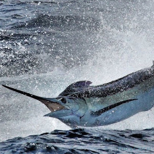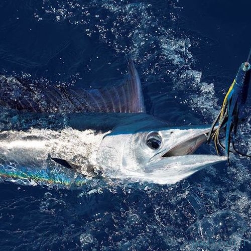 Le marlin bleu aussi nommé le makaire bleu (Makaira nigricans) est probablement le poisson plus populaire entre les pêcheurs. Ce poisson, connu pour sa lutte explosive, se nourrit surtout pendant la journée de calamar, poisson et poulpes. En haute mer, l'on cible ce déprédateur généralement à la traine avec des leurres et avec des appâts naturels (bonite, maquereau...)