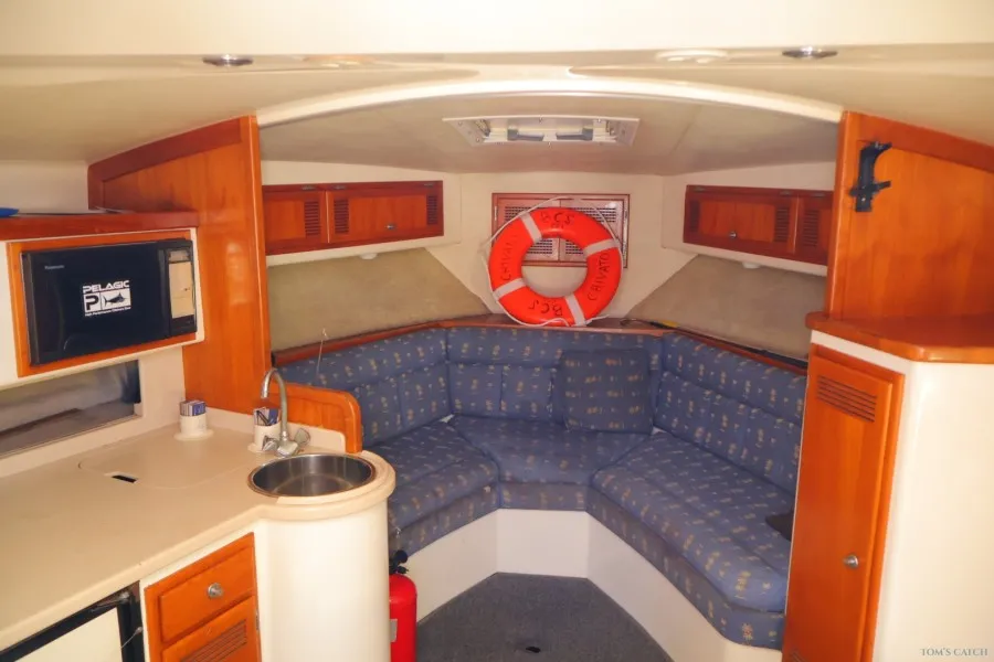 Perfecto para hasta 6 personas, el barco cuenta con una cabina espaciosa, equipo de pesca de primera calidad, electrónica avanzada, un vivero para cebo vivo y un tubo para atún: todo lo necesario para una salida de pesca exitosa en busca de especies como el marlín, el atún y el dorado.