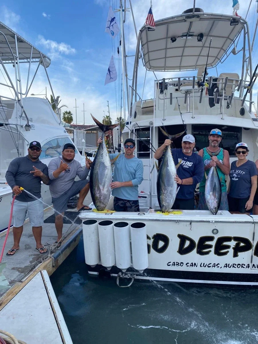 Pesca desportiva no Cabo San Lucas a bordo do Go Deeper - Tom's Catch Experiência de pesca desportiva no Cabo San Lucas a bordo do Go Deeper, um potente Bertram de 37 pés concebido para aventuras de pesca extremas. Este barco tem capacidade para 6 a 8 pessoas, sendo perfeito para Pescadores principiantes e experientes. O Go Deeper é um barco de pesca para torneios, vencedor de vários torneios no Cabo San Lucas. Está equipado com carretos eléctricos, carretos de dragagem LP1200, tubos de atum e pronto para lidar com qualquer coisa que o oceano lhe atire. Reserve o seu Charter de pesca no Cabo San Lucas com a Tom's Catch a bordo do Go Deeper e desfrute de uma experiência de pesca de alto mar profissional, emocionante e inesquecível.