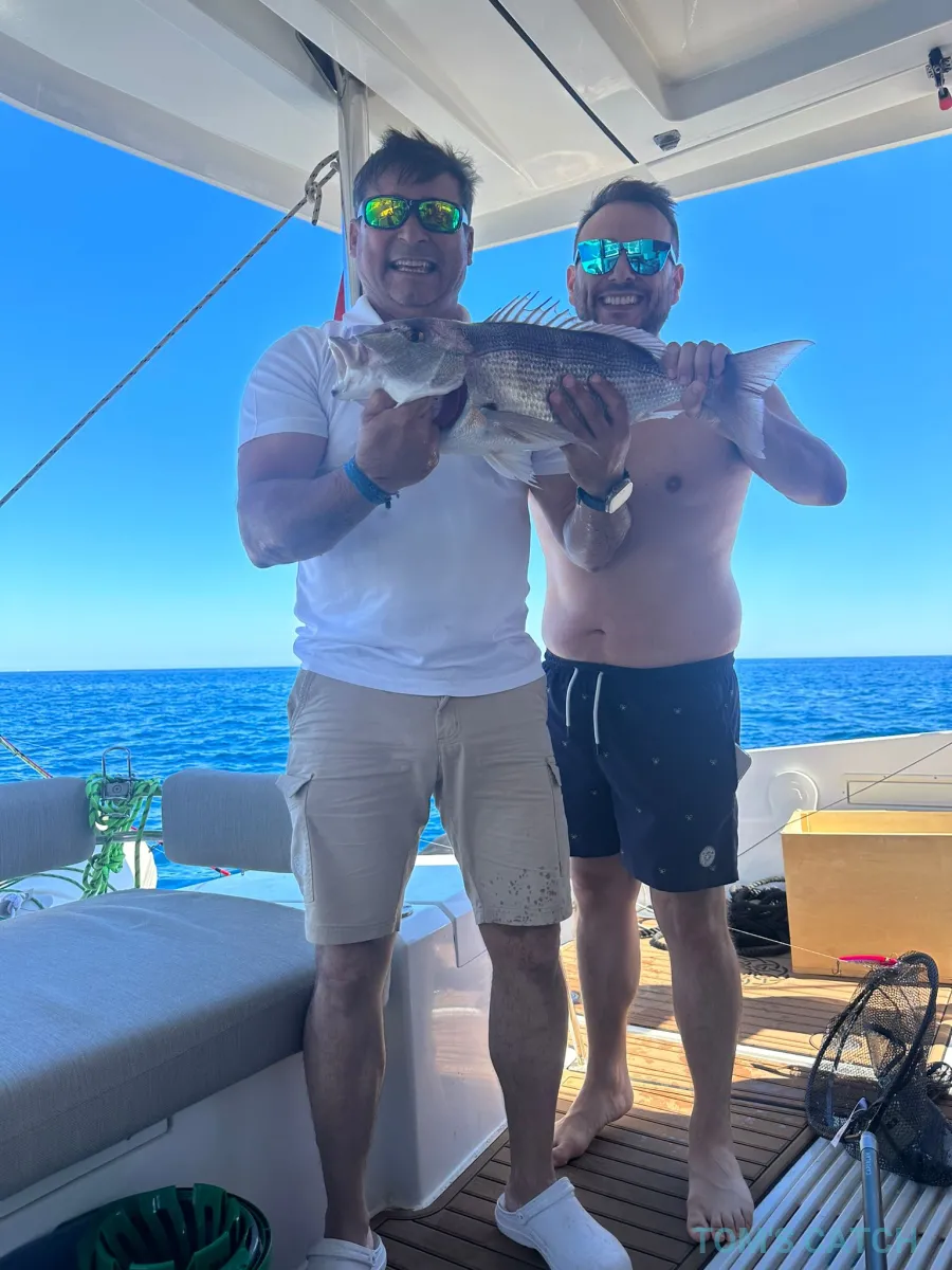 Catamarã com um amplo convés de popa (7 metros), permitindo uma pesca com várias canas sem complicações. O baixo bordo livre na popa facilita o transporte do pescado para bordo.