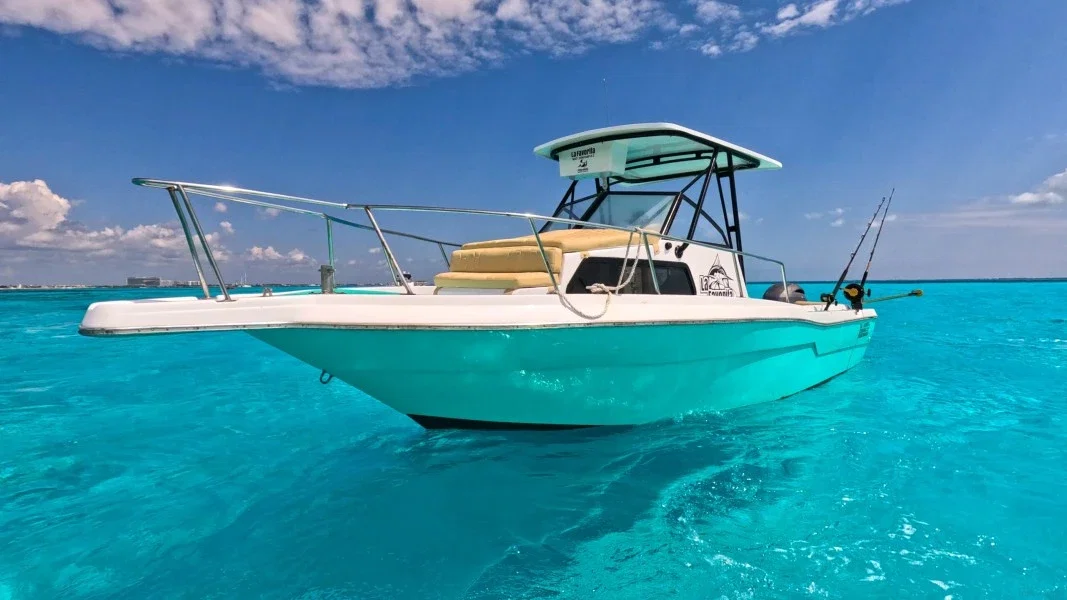 La Favorita - Cancun Fishing Boat: Deep Sea Adventure Experience the thrill of deep sea fishing in Cancun aboard our impressive Boat, 'La Favorita'. Designed to offer an unforgettable experience, this 24-foot Boat is the perfect choice for adventurers looking to capture the treasures of the sea in one of Mexico's most exciting Fishing destinations. With capacity for small groups, La Favorita combines comfort and agility, offering the ideal space for successful Fishing. Equipped with everything you need for deep-sea fishing, including high-quality fishing gear, an experienced Guide and a spacious fishing platform, you'll be ready to cast your rods and tackle the most challenging catches. We set sail from Cancun's Puestas del Sol Marina, a strategic location that gets you quickly to the most promising fishing grounds. Whether you are an experienced Angler or a beginner, our team will be at your service to make sure you enjoy a successful day of Fishing. In Cancun, the fishing paradise, exciting offshore adventures await you. Booking our 24-foot Boat today and discover why we are the preferred choice for sport fishing enthusiasts in this breathtaking region, get ready for a unique Fishing Experience you will remember forever!