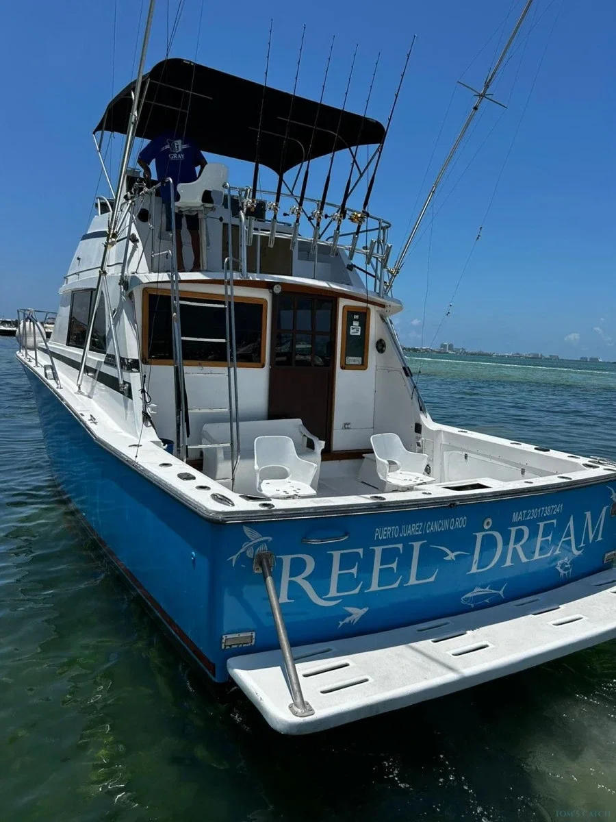 Cancun Fishing charter - Reel Dream (Bertram 40ft) Enjoy an authentic Cancun sport fishing adventure aboard the Reel Dream, a 40ft Bertram Boat available from Tom's Catch. This private charter is ideal for those looking to catch Species such as Marlin, Dorado, Tuna or Wahoo in the crystal clear waters of the Mexican Caribbean. With an expert local crew and all the amenities for safe sailing, the Reel Dream is the perfect choice for your next Cancun Fishing trip. A $10 USD dock tax per person applies, payable at the dock.