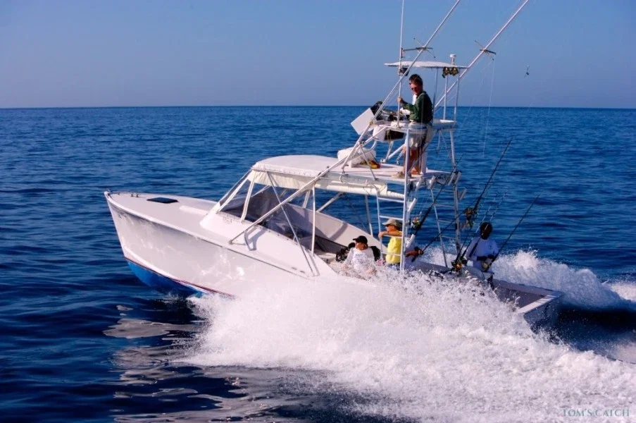 The boat is a 31’ custom-built Palm Beach, fully equipped with a marlin tower, tuna tubes, live bait well, fighting chair, and a toilet inside the cabin, ensuring comfort and top performance at sea.