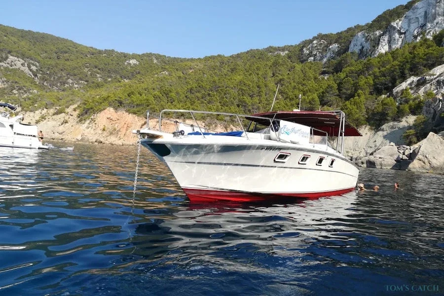 If you want to live an unforgettable gastronomic experience, come aboard the Blue, Toni & Pepita's Boat. Although we normally start the adventure around 11 a.m., Toni & Pepita have been awake since 4 a.m. in order to buy the best food on the island and to prepare the food for the day. After leaving the port of San Antonio, we head to a cove sheltered from the wind and the waves. There we anchor for the day. While the passengers take a swim in the crystal clear waters (with snorkeling if they want), Toni and Pepita offer them an aperitif with champagne or caya and get down to work. After the pica pica with ham, cheese, pork loin, fuet, we serve the best shrimp in the world, those of Ibiza (of course). Then fresh lobster, followed by fish: dentex, rooster San Pedro, scorpion fish (scorpion fish), grouper .... For dessert there is fruit, flaò - typical Ibicencan mint cake - and sweets. And as there is time to continue enjoying the Mediterranean life, we serve coffee, shots and Pepita's specialty: sangria! If you are thirsty afterwards: gin and tonics until sunset. See Experience Video >> Ibiza Fishing Blue is also a professional Fishing charter that organizes Fishing trips from San Antonio, Ibiza. Everything is on board to enjoy a wonderful day light tackle fishing in Ibiza. We offer half day or full day fishing trips and go an extra mile to ensure your trip is memorable and productive. Everyone is welcome aboard - from novice to experienced Anglers, corporate and family anglers, to corporate and family fishing charters. Booking your charter boat now and enjoy a great day fishing in Ibiza!
