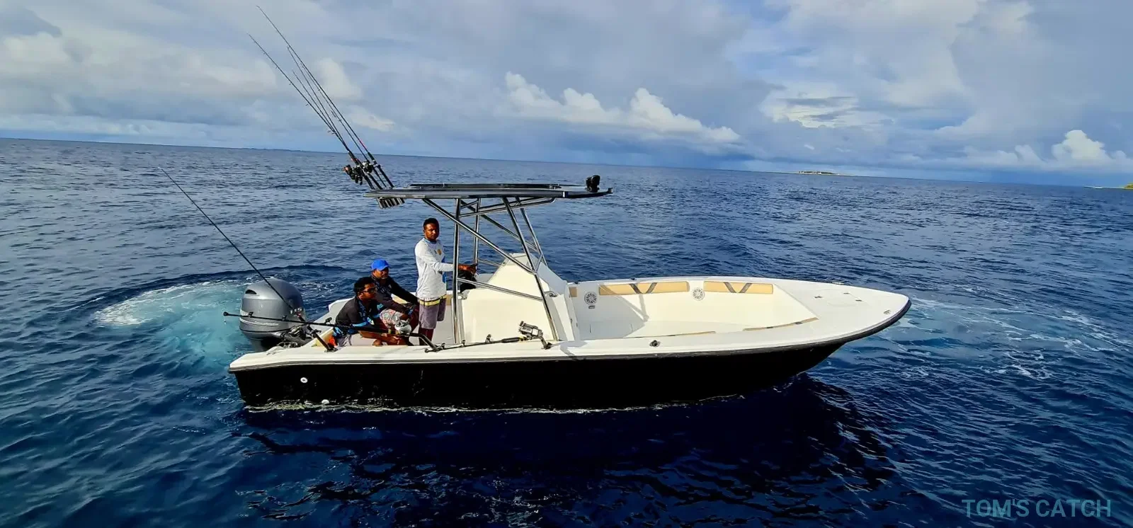 Captain Abdulla and his crew offer great Fishing adventures amidst the breathtaking beauty of the Maldives. Our Fishing charter is based in the pristine Baa Atoll. Set sail aboard our top-of-the-line 24-foot center console boat, powered by a sturdy 200hp Yamaha outboard engine, promising speed and reliability for an unparalleled fishing getaway. Get ready to chase prized catches such as wahoo, sailfish, GT and yellowfin tuna as we take to the blue waters. Our charter is fully equipped for various fishing techniques, offering live bait with hand line along with a wide range of rods, jigs, and specialized fishing gear suited for trolling, casting, jigging, deep water, etc. With a professional Captain at the helm, guests can rely on expert guidance and a wealth of local knowledge to ensure a successful and exciting fishing experience. To complement the adventure, we offer a wide range of refreshments, snacks and tasty treats, ensuring a comfortable and enjoyable excursion. Our charter service, which conveniently caters to guests from Baa, Raa and Lhaviyani Atolls, offers a hassle-free pick-up for a hassle-free start to an unforgettable day of fishing in the Maldives.